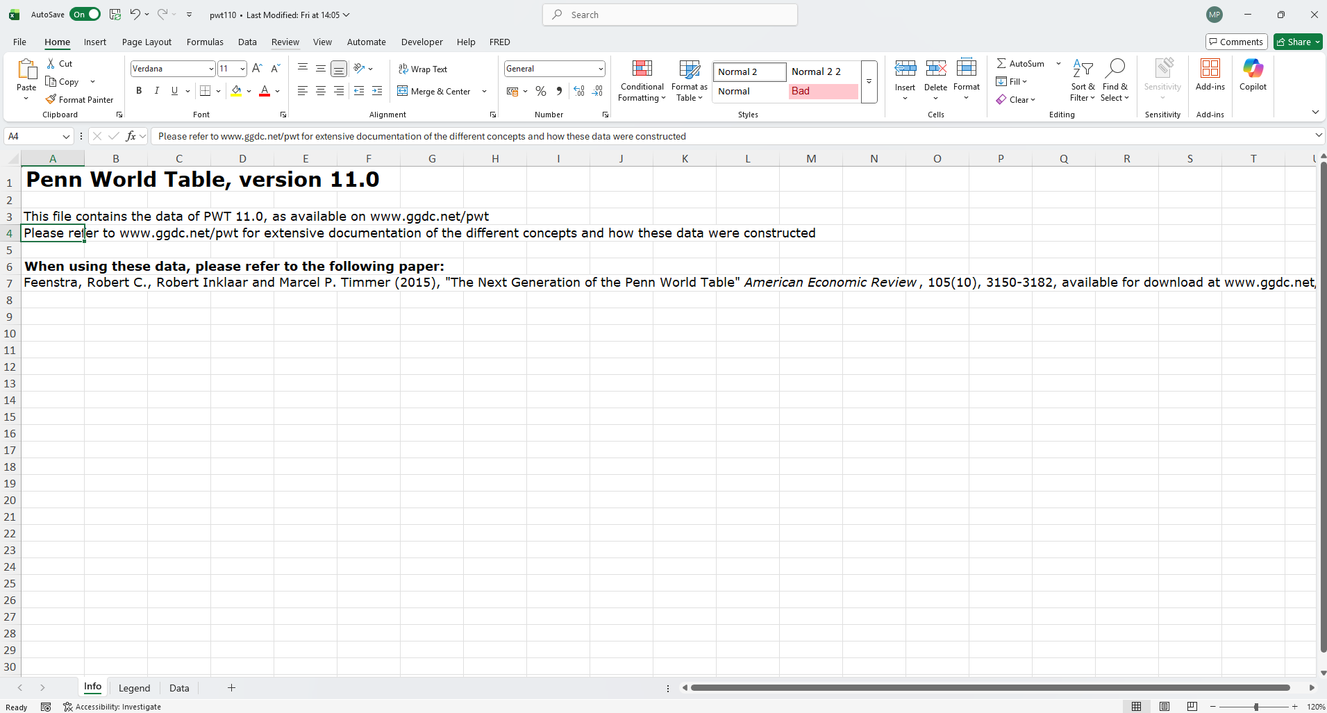 Download the PWT PWT 11.0 Excel spreadsheet here and save it in a folder entitled PWT. The spreadsheet contains three sheets: “Info”, “Legend” and “Data”.