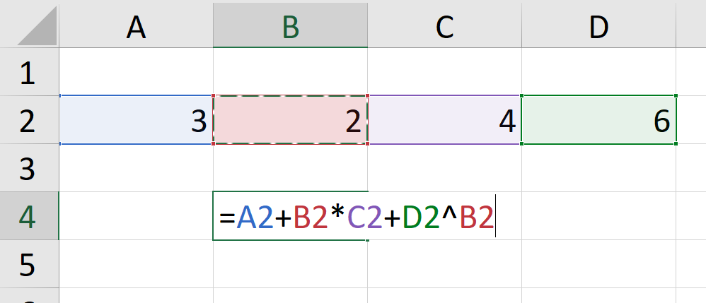 Example 1: to calculate “\(3 + 2 \times 4 + 6^2\)”, it is possible to enter separately the values 3, 2, 4 and 6 into separate cells and then write a formula to perform this operation referring to the corresponding cells as follows:
