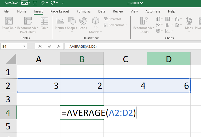 where “A2” is 3, “B2” is 2, “C2” is 4 and “D2” is 6.Example 2: to calculate the average of the four numbers used in the previous example using the AVERAGE() function, select the cells comprising the range of values you want to include in the calculation:
