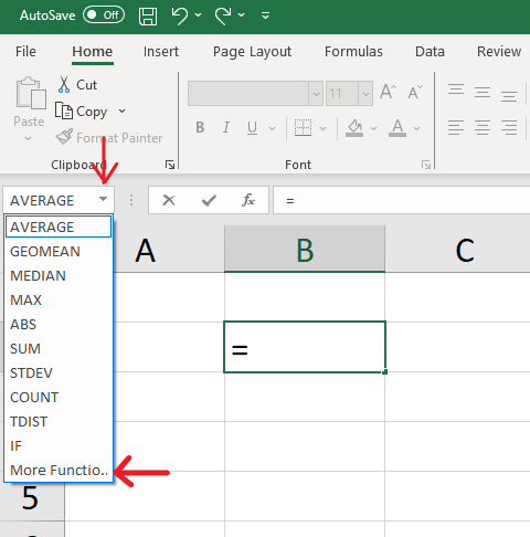 To let Excel help you find the relevant function and use it, select a cell and write an equal sign. In the top left corner, a drop-down menu appears with a list of the most commonly used formulas. If the function you are looking for does not appear here, go to “More Functions” at the bottom of the menu. A search box will prompt you to describe the function you are interested in.
