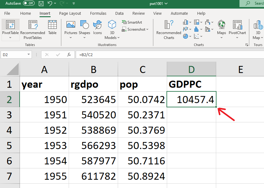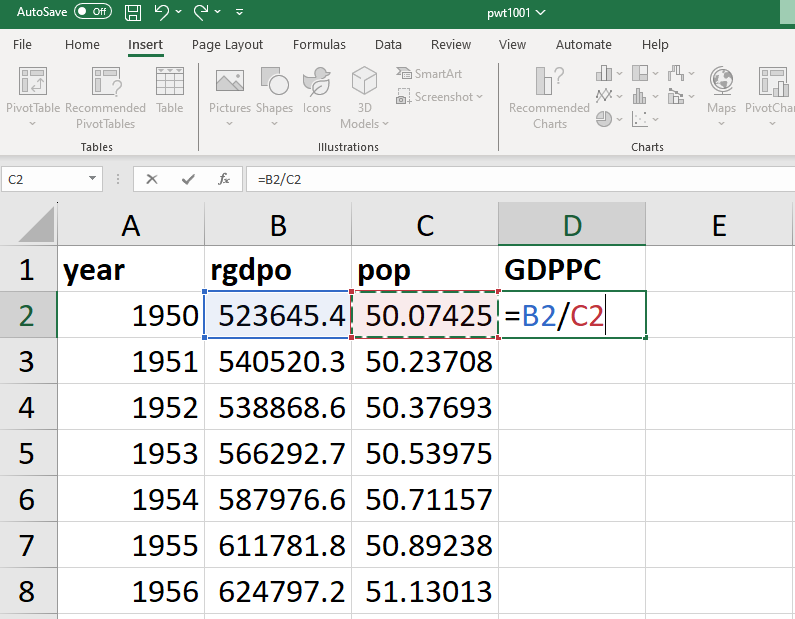 To calculate UK GDP per capita in 1950 we need to divide UK output (“rgdpo”) by UK population (“pop”). Select the cell where you want the result to appear (eg “D2”). The relevant formula for GDP per capita in 1950 is “=B2/C2”. “B2” is UK GDP in 1950, “C2” is UK population in 1950 and “/” indicates that you are dividing the former by the latter. Instead of writing “B2” and “C2” you may just click on the corresponding cells.
