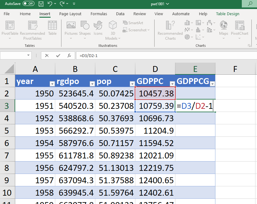 Using the UK GDP per capita series, we can now create the series of annual growth rates of GDP per capita using the discrete time formula \(g_y = \frac{y_t}{y_{t-1}} -1\). For example, the annual growth rate of UK GDP per capita in 1951 is equal to the ratio of GDP per capita in 1951 (“D3”) and in 1950 (“D2”) minus 1.