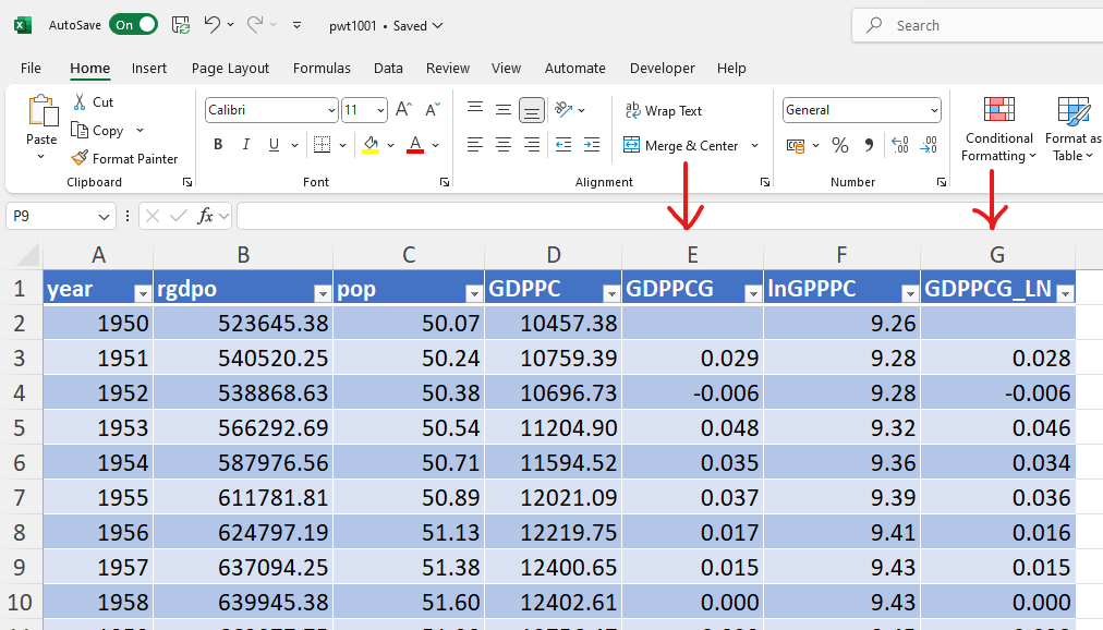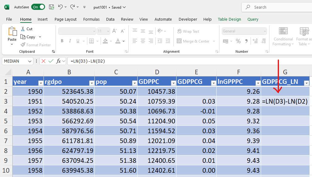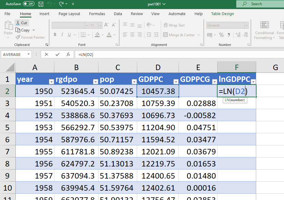 Then copy the formula in all subsequent cells to generate the natural logarithm of GDP in all subsequent years. Important: to calculate the natural logarithm, do not use the LOG() function, which should only be used if you want to calculate the logarithm with a different base!