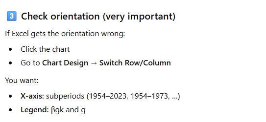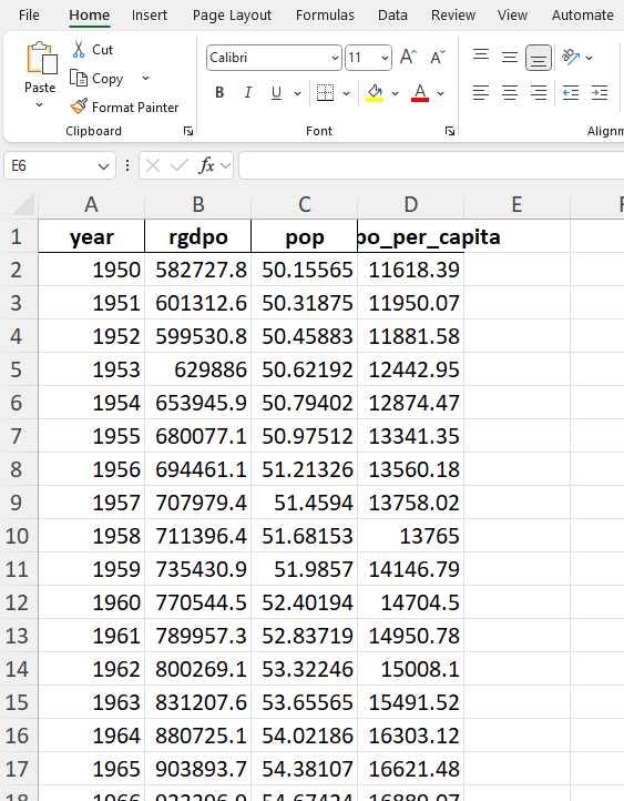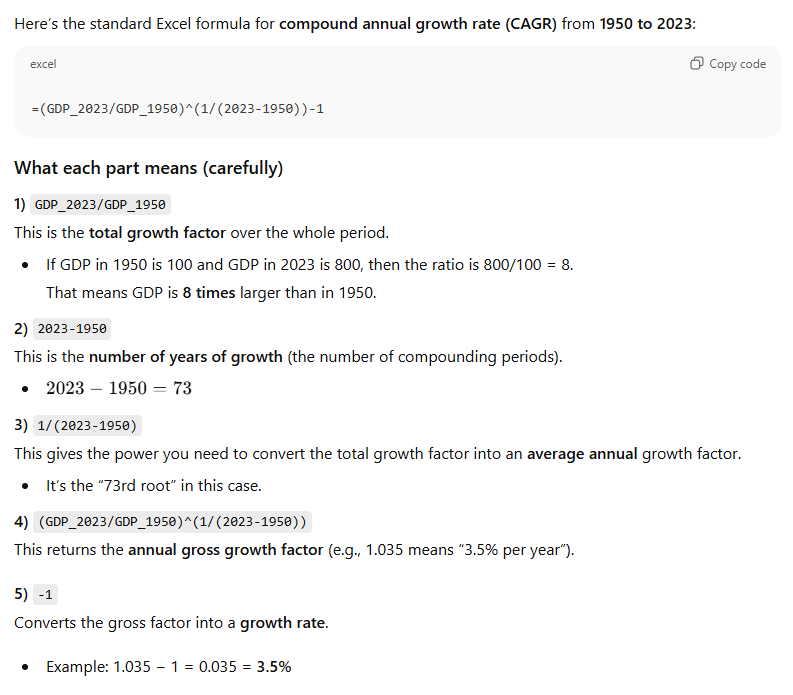 Prompt (ChatGPT 5.2): I have annual GDP data spanning the period 1950 to 2023. Write an Excel formula I can use to calculate the compounded annual growth rate of GDP between 1950 and 2023. Explain carefully the formula.