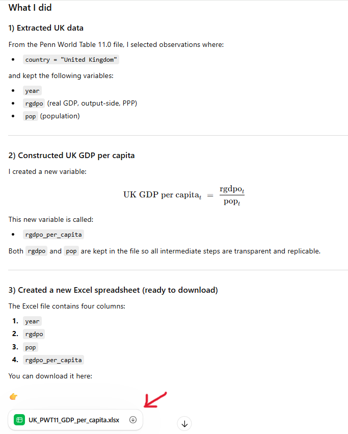 Prompt (ChatGPT 5.2): (attaching pwt110.xlsx) Using the PWT11.0 dataset attached, do the following tasks. 1) Extract “year”, “rgdpo” and “pop” for entries where “country” is equal to “United Kingdom”. 2) Construct the new variable for UK GDP per capita using the variables extracted. 3) Create a new Excel spreadsheet including the new variable, and including all intermediate steps ready to be downloaded.