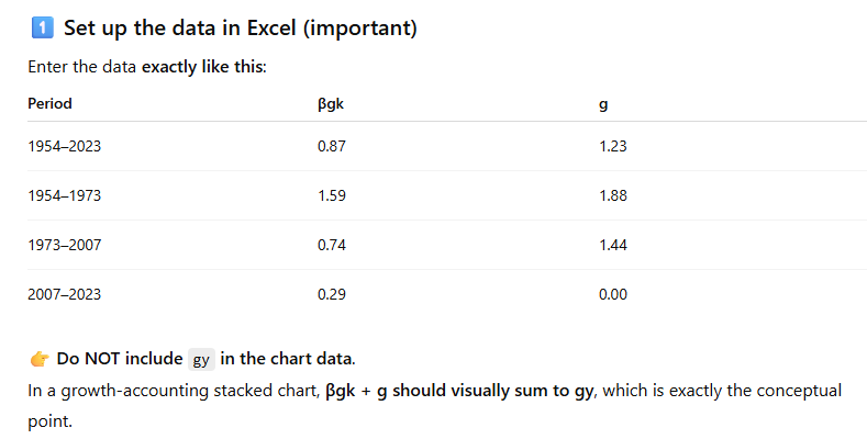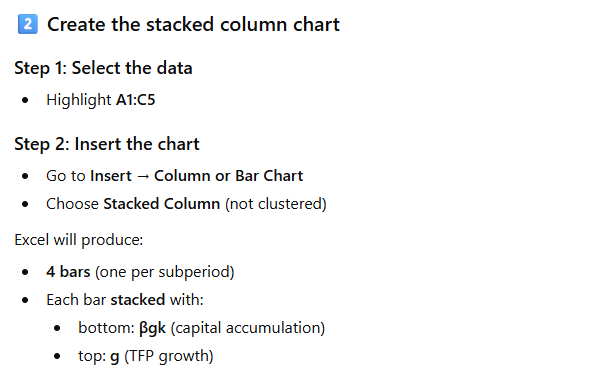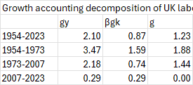 Prompt (ChatGPT 5.2): I would like to create a column chart representing the results of this growth accounting decomposition of UK labour productivity between 1954 and 2023. I want the graph to stack the contribution of capital accumulation (βgk) and TFP growth (g) in 4 different bars corresponding to the 4 subperiods. See data attached.